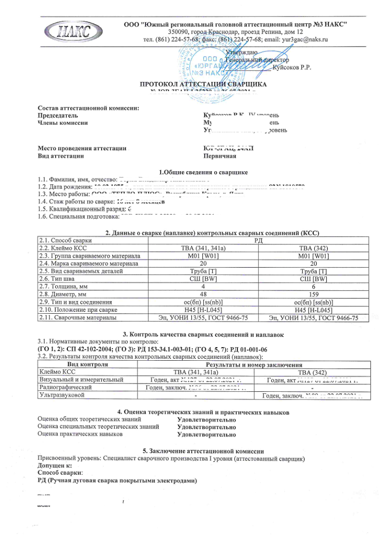 • Протокол аттестации сварщика
